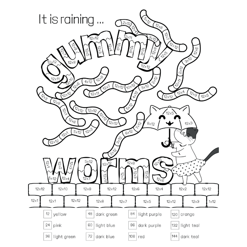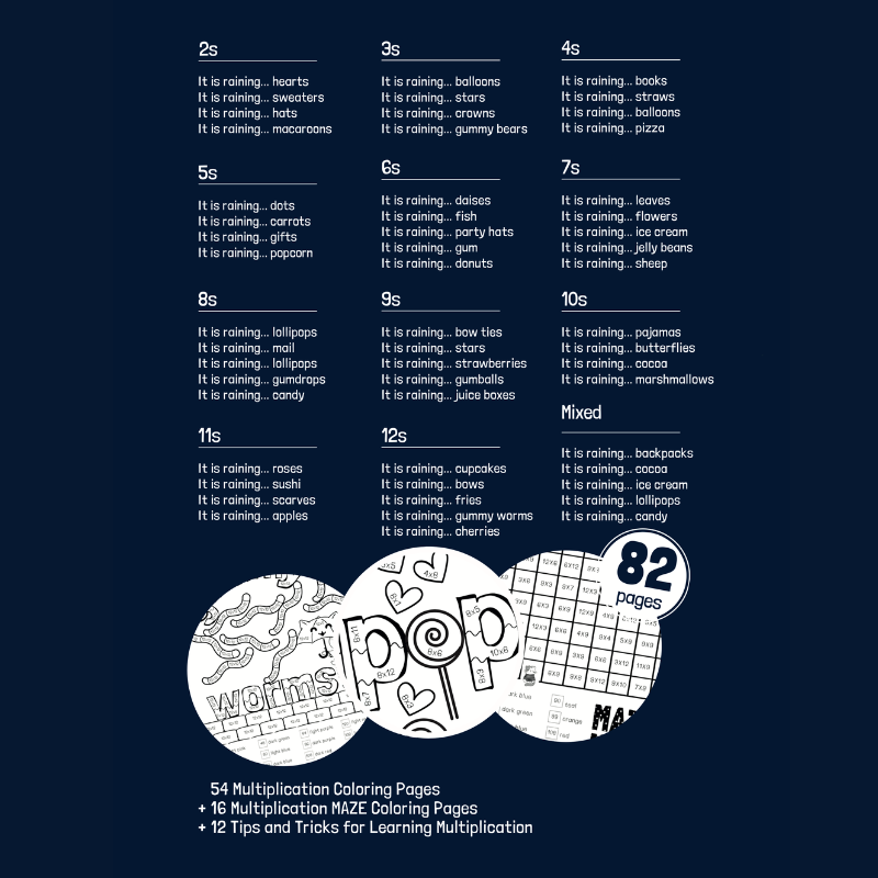 For instance, your child can explore “It is Raining Lollipops” to practice all the 8s, or “It is Raining Fries” to master the 12s, and so on. This math coloring book makes learning multiplication fun and memorable with engaging illustrations and creative themes.